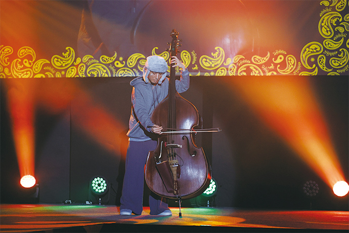 大きな耳がついた象がコントラバスを演奏している中、一緒に踊るアイ。